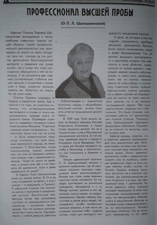 Полина Львовна Шапошникова (11 июня 1924 – 31 октября 2013) родилась в Одессе. В детстве ей прочили карьеру пианистки, но война и эвакуация изменили ее планы, она выучилась на юриста и стала одним из ведущих адвокатов Армении. Представляла армянскую сторону в Сумгаитском процессе 1988 года.